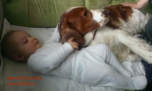 Všem členkám naší dámské welššpringří smečky se malý Daneček moc líbil. Když se mu některá z nich chtěla podívat do očí, tak nemusela vůbec zvedat pohled nahoru a Danečkovi, jako zkušenému kynologovi vůbec nepřišlo divné, že kromě obvyklých dvou červenobílých pejsků jich najednou má kolem sebe sedm. |